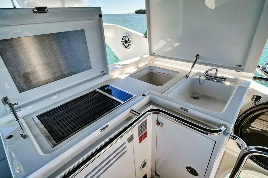 At the heart of the yacht is a well-equipped galley positioned portside midship, featuring a convection oven/microwave, refrigerator, dishwasher, and sleek black countertops.