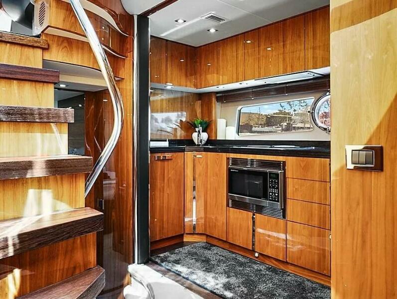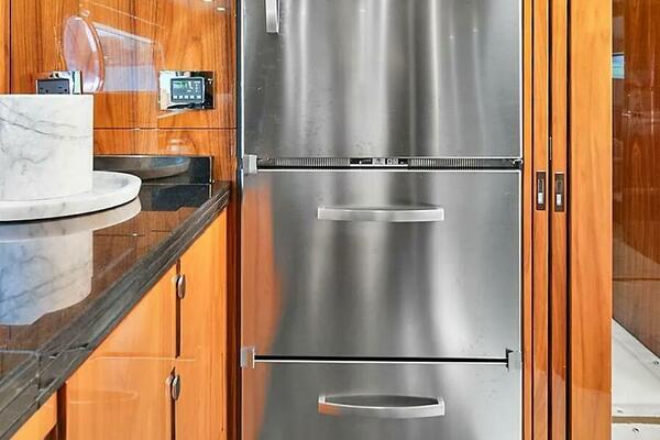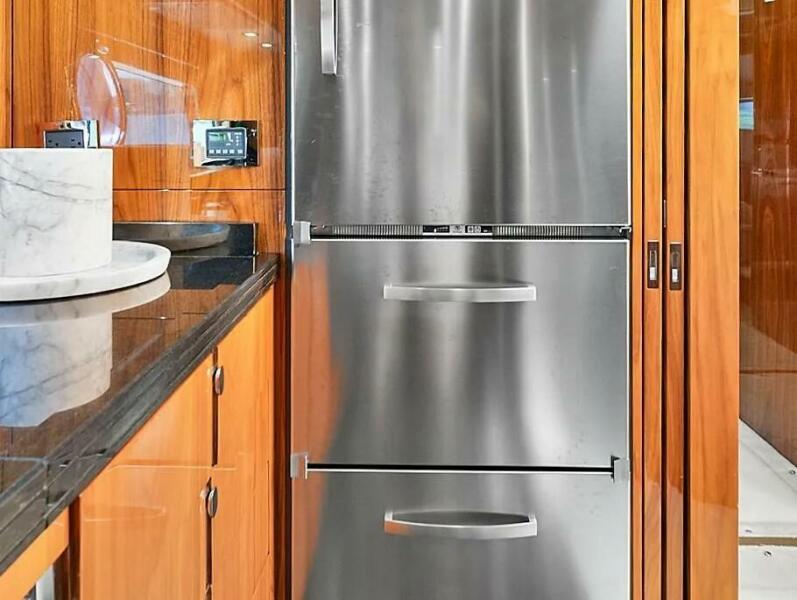 - Lower galley with full size refrigerator, appliances, black granite counter tops and sliding door, separating galley area from lower staterooms
