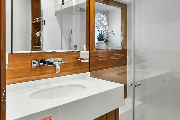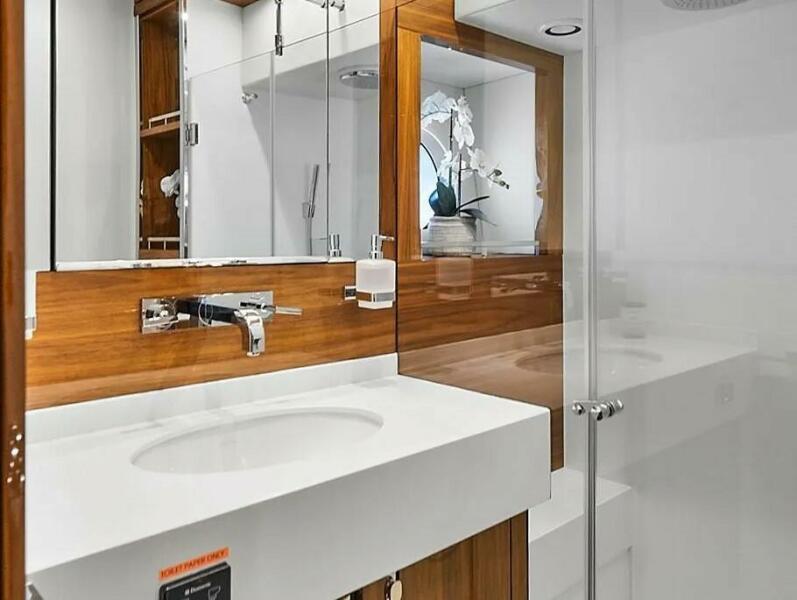- Guest Cabin (Starboard): Twin side-by-side beds with its own ensuite bath.