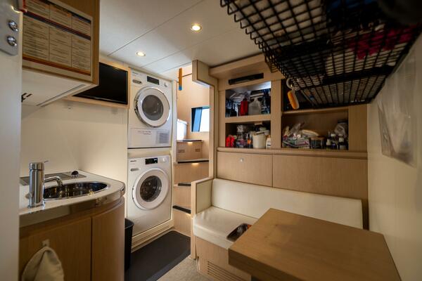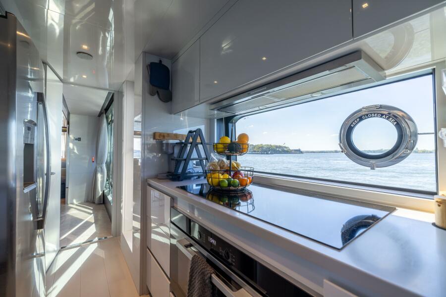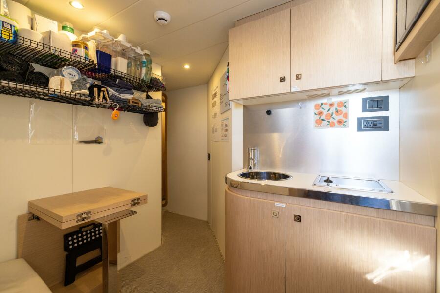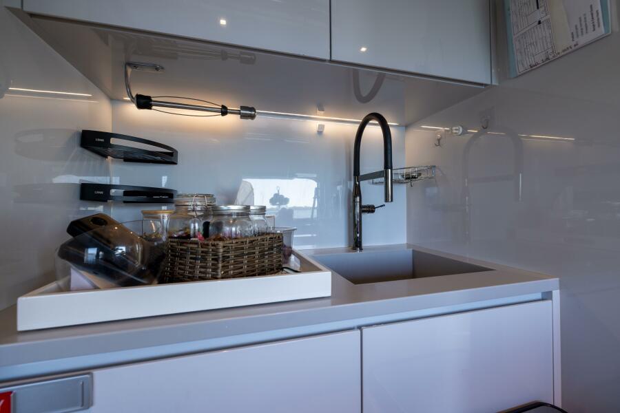 - Galley: Induction cooktop, removable worktop for sink, oven, extraction hood, additional microwave oven and fridge
