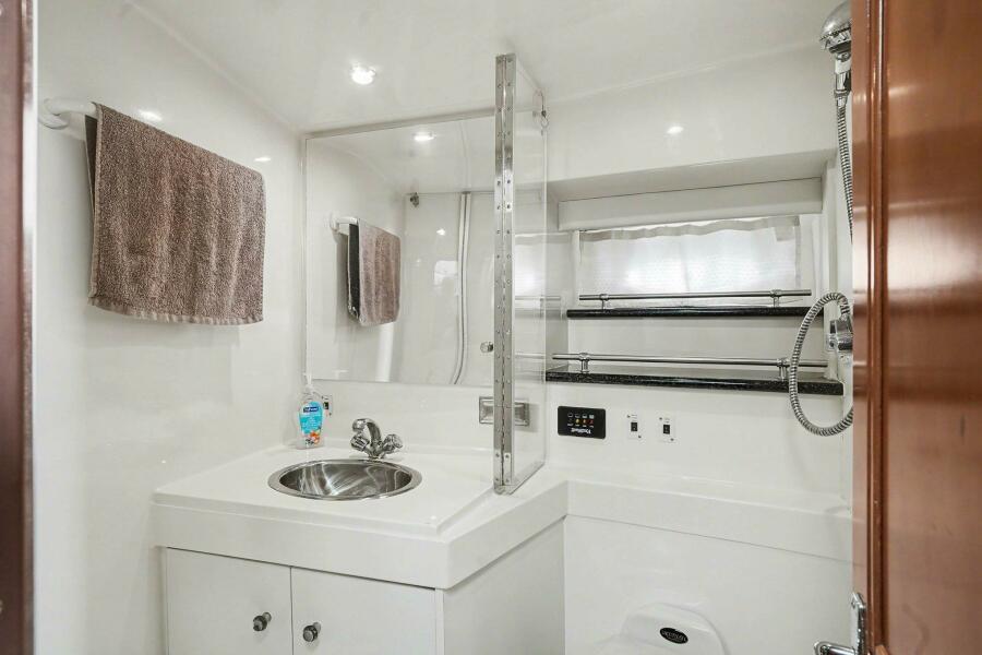 The private aft cabin creates a true owner’s retreat, while the open salon and well-appointed galley make entertaining or relaxing aboard feel natural and unconfined. Large windows throughout bring in abundant natural light, giving the interior a bright, welcoming feel whether you’re dockside or underway.