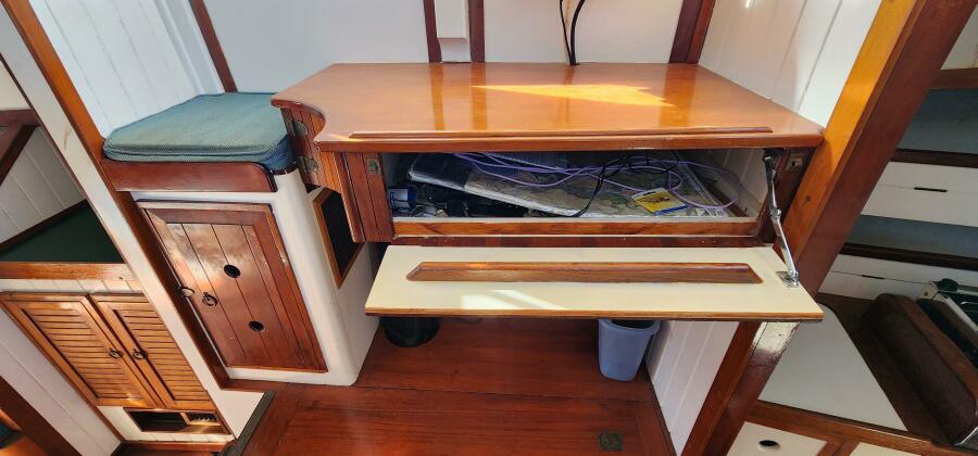 Her hull was designed by Bill Garden, who also designed boats for Willard. This hull was laid up by Tillotson-Pearson in 1975 and is solid fiberglass below the hull-deck joint. She received her engine at this time and then was carefully stored in an indoor warehouse for the next 20 years. In 1996 she was purchased by a couple of shipwrights who built her out and finished her topsides and interior. She was documented and launched for the first time later that year. As such, she has a hull number from 1975 but a USCG documentation of 1996. Hesper's current owner is her fourth, and he has done an admirable job of maintaining and caring for her over the past several years of his ownership. She is waiting for her new owners to take over and enjoy her beauty, comfort and charm. With her new mainsail and well-sorted 60hp diesel engine she is ready to go cruising ASAP!