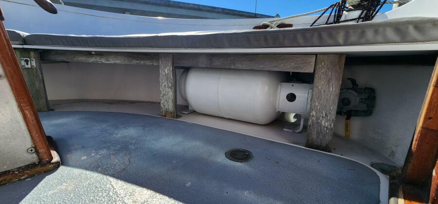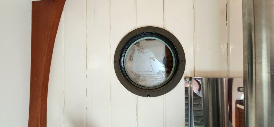 Hesper is a classy little double-ender with sturdy, yet graceful lines. She has two helms: one in the pilothouse and an open helm in the aft cockpit. Both helms have traditionally styled bronze steering wheels. The aft cockpit offers ample seating on cushioned benches with high coamings to help keep passengers dry and safe. There is an emergency tiller setup under the exterior helm seat should there ever be a problem with her hydraulic steering system. Most sail controls can be accessed from the cockpit and aft part of her coachroof. Moving forward from the cockpit there is good room on the foredeck, where you will find a robust, bronze Muir manual windlass with heavy chain, 33lb Bruce anchor and deck cleats. The deck is open and uncluttered.