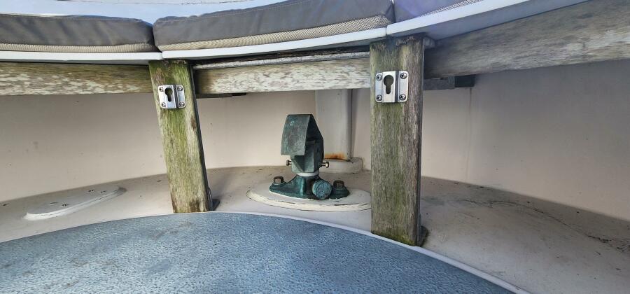 Moving forward from the main salon is the pilothouse. You will immediately notice plenty of light and visibility due to windows forward, side and aft. There is a navigation station with storage to port and a simple helm station with wheel, compass, engine controls, autopilot control head and depth sounder to starboard. The engine control panel is located to the right of the helm here. The helmsman has a nice, cushioned seat and a foot stool for comfort. Below the floor panels is the boat's engine and dual-Racor fuel filters.