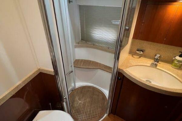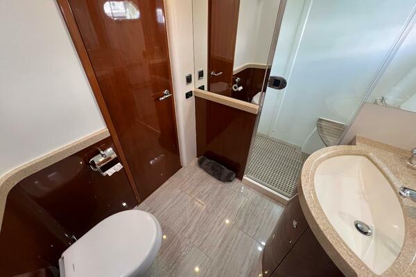 Sliding glass doors open into the vast main salon, which features a large u-shaped seating which has storage underneath. Directly across resides a love seat and entertainment center, with a wine chiller and storage and liquor cabinet. Samsung flatscreen tv with satellite and Bose surround sound complete the entertainment system. There is also a spiral staircase that leads to the fly bridge for additional entertainment.
