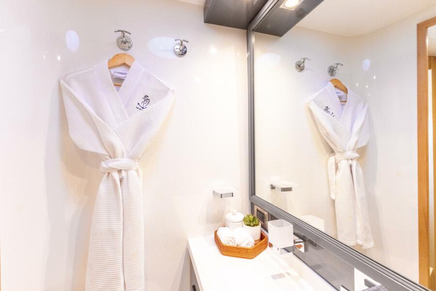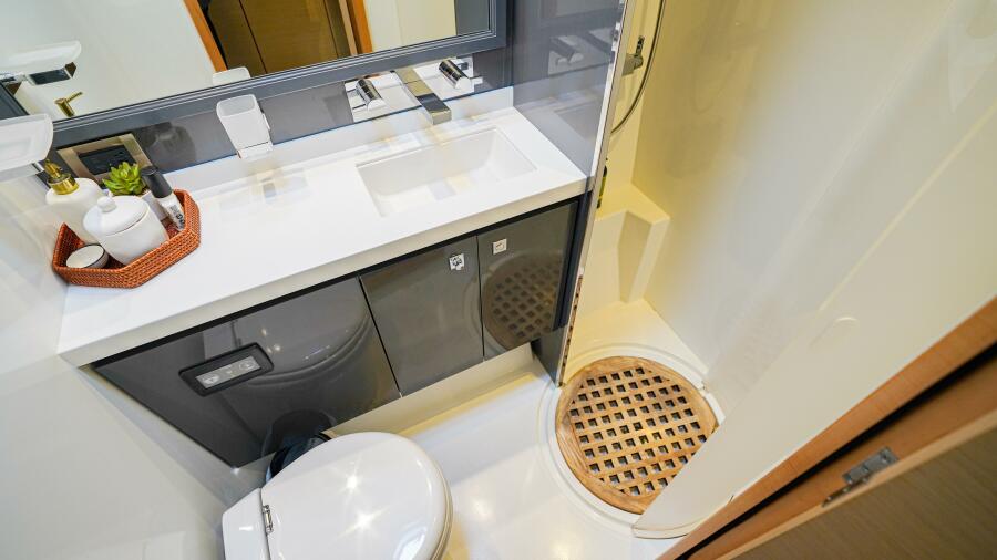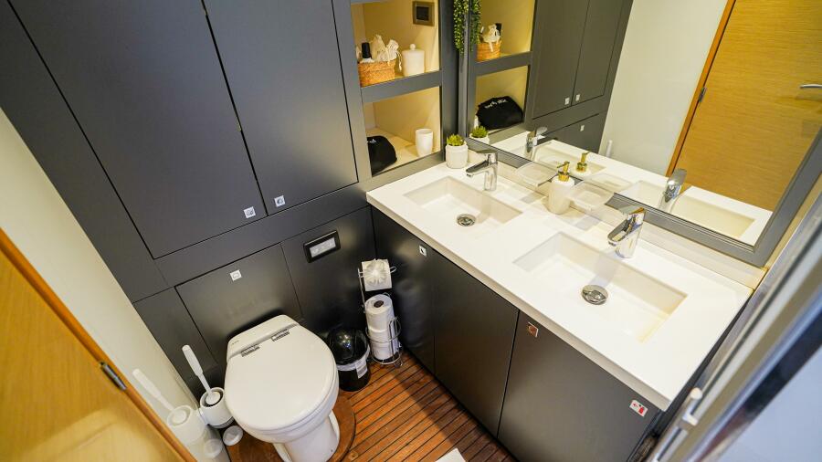 Heading down into the accommodations, the layout is ideal for both charter operations and owner use. The master cabin features a king berth, twin sinks, and an oversized shower, creating a true owner’s suite. There are four additional guest cabins, three queens and one convertible twin-to-king, all with ensuite heads and separate showers. Both forepeaks are outfitted with beds, heads, and air conditioning.
