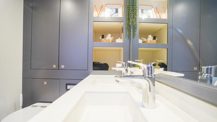 - Owner’s master cabin with king bed, twin sinks, and oversized shower